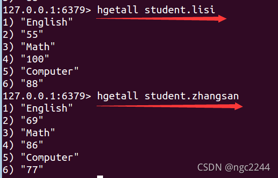 - 用hgetall命令分别输出zhangsan和lisi的成绩信息;