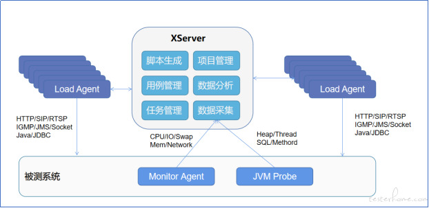 - 负载生成器(Load Agent):负责产生虚拟用户,运行性能测试脚本并对被测系统进行性能加压。采取分布式架构,并发执行用户场景,并将统计指标数据及日志返回到 XServer。