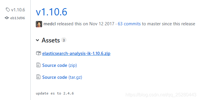 ? 下载中文分词器:Release v1.10.6 · medcl/elasticsearch-analysis-ik · GitHub