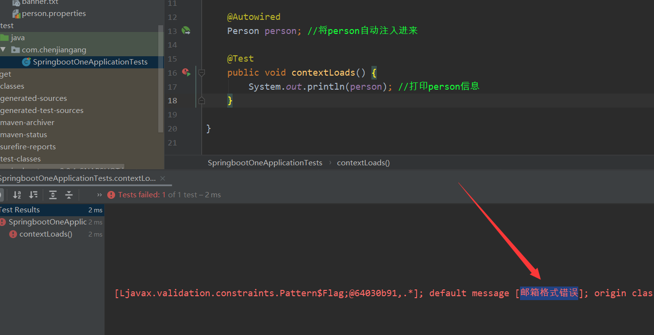 4、运行看一下,我们发现他报错了,因为我们的name不是邮箱格式,报了一个邮箱格式错误,那是因为,我们设置了 message=“邮箱格式错误”